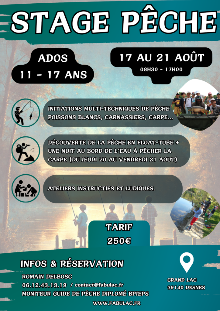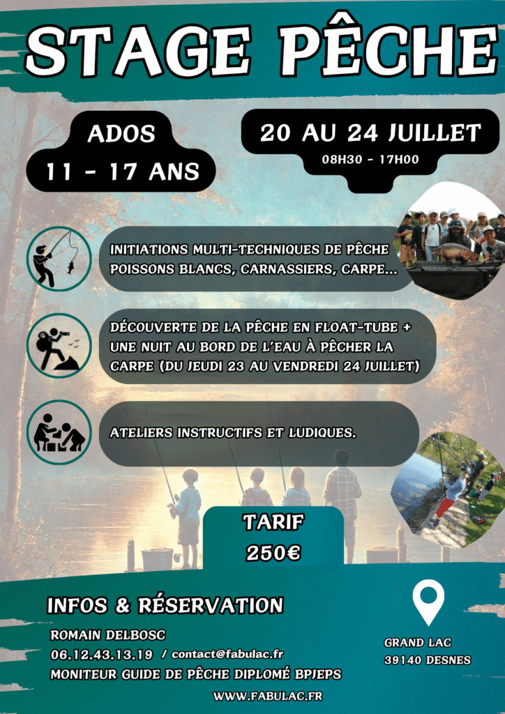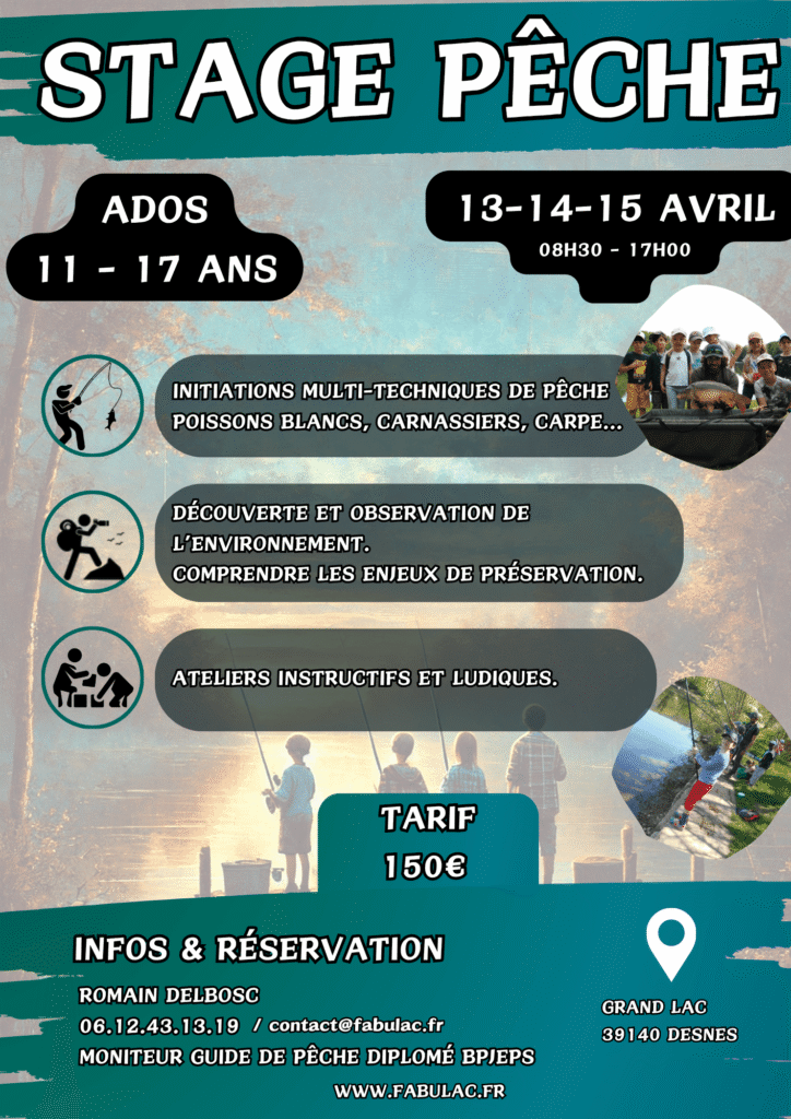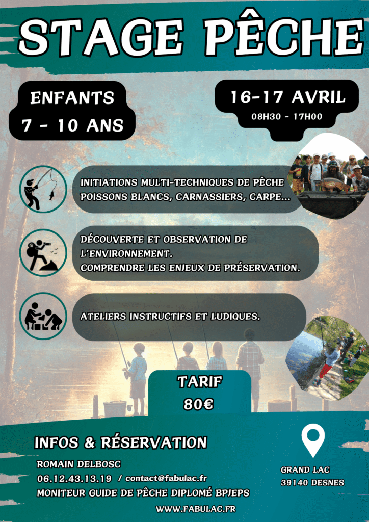 Vous cherchez un stage de pêche pour enfant ou ado ? Fabulac propose des stages d’initiation et de perfectionnement encadrés par un animateur diplômé. L’objectif est simple : apprendre à pêcher, comprendre le milieu aquatique et attraper ses premiers poissons en toute sécurité. Une expérience ludique et éducative !